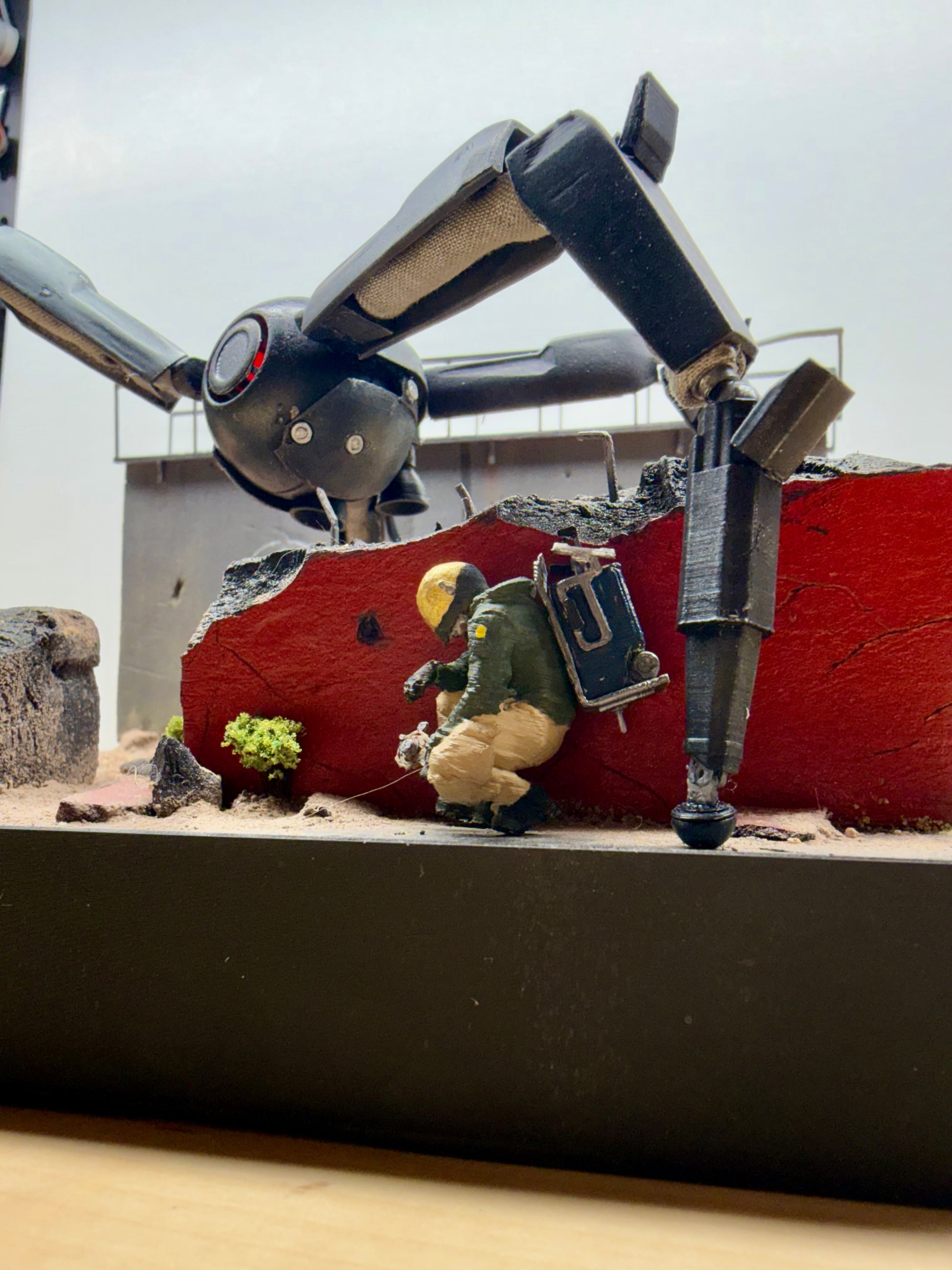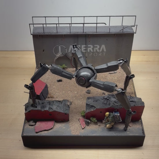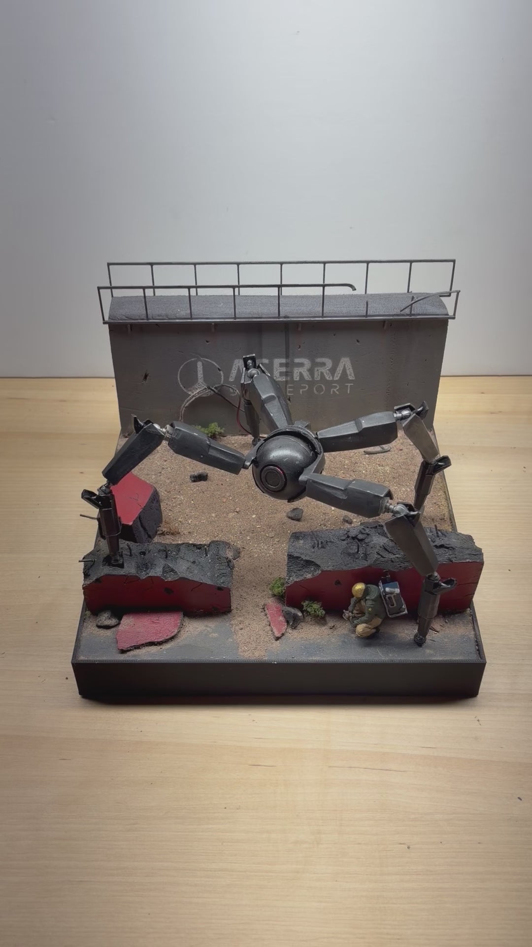 This one of a kind Arc Raiders diorama features a scratch built Leaper as it clambers through the ruins of the Acerra Spaceport. The Leaper’s core features a red LED powered by two AA batteries.